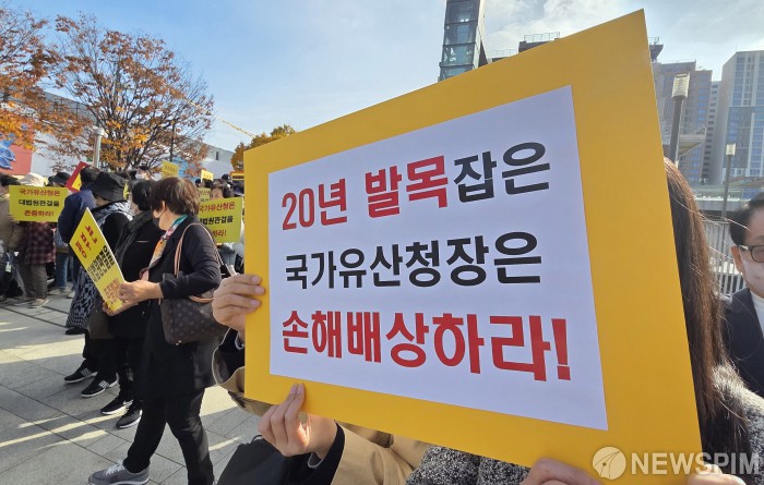 [서울=뉴스핌] 양윤모 기자 = 세운4구역 토지주들이 11일 오후 서울 종로구 종로3가 다시세운광장에서국가유산청이 유네스코 세계유산인 종묘 인근 세운4구역 재개발 사업에 문제를 제기한 데 대해 기자회견을 개최하고 있다. 세운4구역 토지주들은 "국가유산청이 재개발을 불가능하게 한다면 부당한 행정 행위에 대한 책임을 물어 손해배상·직권남용 등 민형사상의 책임을 물을 것"이라며 반발했다. 2025.11.11 yym58@newspim.com