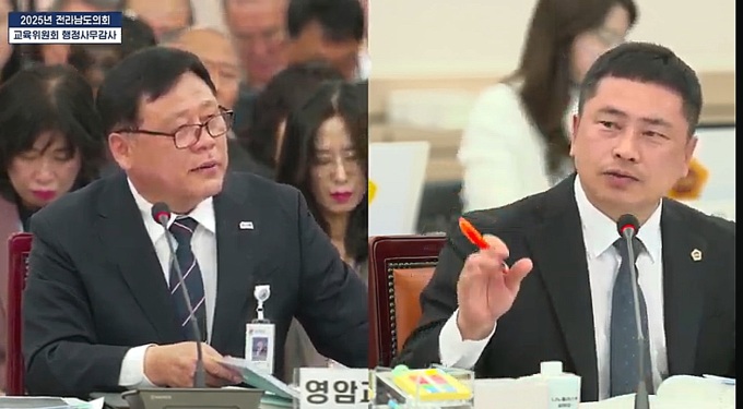 [무안=뉴스핌] 조은정 기자 = 11일 전남도교육청 행정사무감사에서 임형석 전남도의원(오른쪽)이 김광수 영암교육지원청 교육장에게 질문하고 있다. 2025.11.11 ej7648@newspim.com