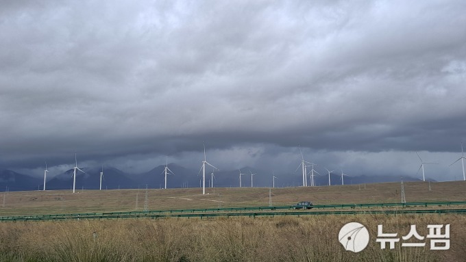 | [서울=뉴스핌] 최헌규 중국전문기자= 중국 칭하이성 국도변 공터에 대단위 풍력 발전 단지가 조성돼 있다. 사진= 뉴스핌 최헌규 기자 촬영.2025.11.12 chk@newspim.com |