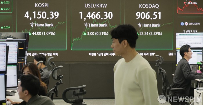 [서울=뉴스핌] 양윤모 기자 = 12일 오후 코스피가 전장 종가보다 44.00 포인트(1.07%) 상승하며 4150.39로, 코스닥은 22.24 포인트(2.52%) 상승한 906.51로 장을 마감한 가운데, 서울 중구 하나은행 딜링룸에서 직원들이 업무를 보고 있다. 서울외환시장에서 달러/원 환율은 전장 대비3.00원 상승한 1466.30원에 거래를 마감했다. 2025.11.12 yym58@newspim.com