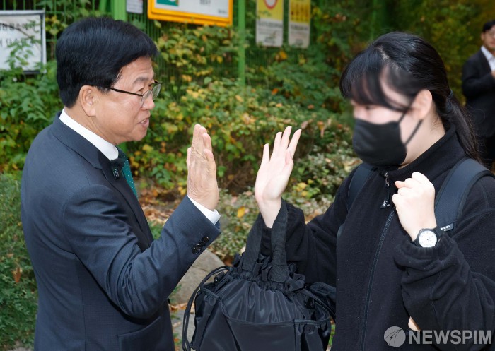 [서울=뉴스핌] 류기찬 기자 = 최교진 교육부 장관이 13일 오전 서울 영등포구 여의도여자고등학교에 마련된 시험장에 방문해 수험생들을 격려하고 있다. 2025.11.13 ryuchan0925@newspim.com