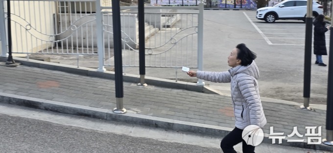 [동해=뉴스핌] 이형섭 기자 = 강원 동해시 북평여자고등학교 정문에서 2026학년도 대학수학능력 시험을 치르는 수험생들을 응원하던 교육기관 관계자가 택시 기사에게 수험표를 받아 달려가고 있다.