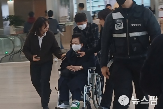 휠체어에 탑승한 이 전 위원장은 '진관사 회동에서 어떤 얘기 나눴는지', '코바나컨텐츠에서 (김건희 여사를) 다시 만난 이유', '김 여사에게 금거북이, 공예품을 주고 국가교육위원장직을 청탁했는지', '적격성 검토서는 왜 전달했는지' 등 질문에 고개를 가로저었다.