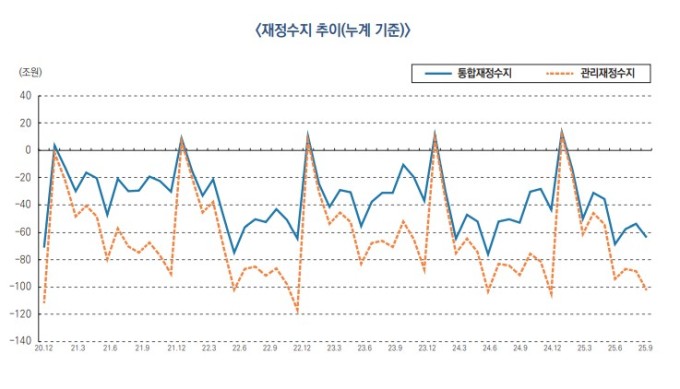 통합재정수지에서 사회보장성기금수지 흑자(39조원)를 제외한 관리재정수지는 102조4000억원 적자로 확인됐다.