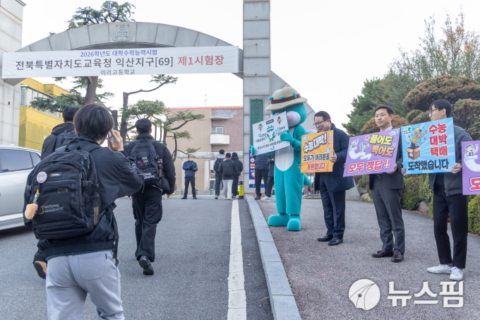 정헌율 익산시장은 이날 이른 아침 이리고등학교 정문 앞에서 수험생들을 만나 "우리 수험생들의 오랜 노력이 결실을 맺는 날"이라며 "그동안 쌓아온 실력을 믿고 평소처럼 침착하게 시험에 임하길 바란다"고 격려했다.