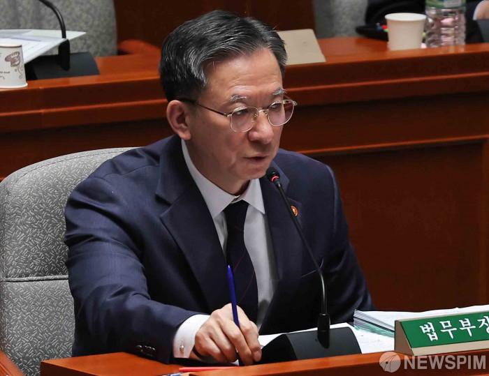 [서울=뉴스핌] 윤창빈 기자 = 정성호 법무부 장관이 13일 서울 여의도 국회에서 열린 예산결산특별위원회 전체회의에서 의원 질문에 답변하고 있다. 2025.11.13 pangbin@newspim.com