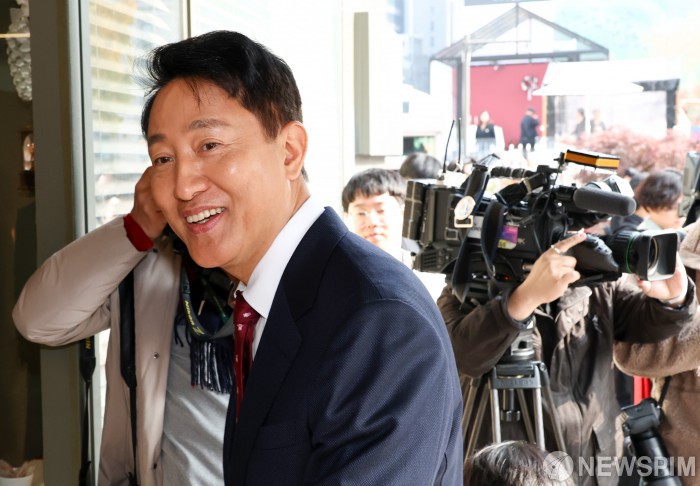 [서울=뉴스핌] 최지환 기자 = 오세훈 서울시장이 13일 서울 중구 달개비컨퍼런스에서 김윤덕 국토교통부 장관과 회동을 위해 이동하고 있다. 2025.11.13 choipix16@newspim.com