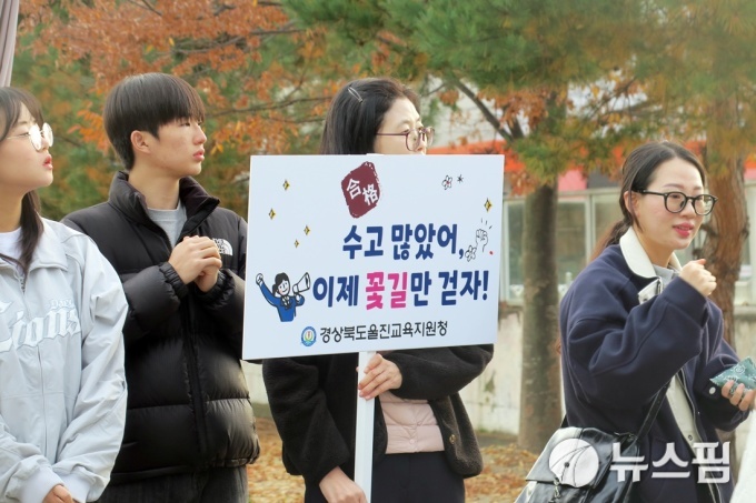 [울진=뉴스핌] 남효선 기자 = 13일 '2026학년도 대학수학능력시험'이 치러지는 경북 울진고등학교 정문에서 지역 교사들이 손팻말을 들고 고사장으로 들어서는 수험생들을 응원하고 있다. 2025.11.13 nulcheon@newspim.com
