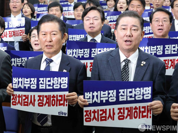 [서울=뉴스핌] 윤창빈 기자 = 정청래 더불어민주당 대표, 김병기 원내대표 등 소속 의원들이 13일 서울 여의도 국회에서 열린 의원총회에서 정치검사를 규탄하는 피켓팅을 하고 있다. 2025.11.13 pangbin@newspim.com