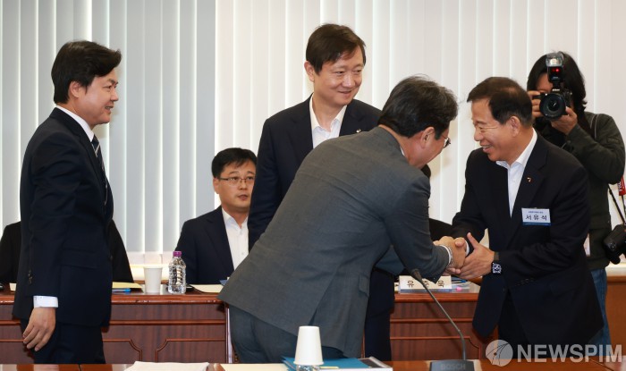 [서울=뉴스핌] 김학선 기자 = 이찬진 금융감독원장과 서유석 금융투자협회장이 13일 서울 여의도 금감원에서 열린 금융소비자보호 중심의 금융감독 전환을 위한 금융소비자보호 토론회에서 국회 정무위원회 소속 더불어민주당 김승원, 김현정 의원과 반갑게 인사를 나누고 있다. 2025.11.13 yooksa@newspim.com