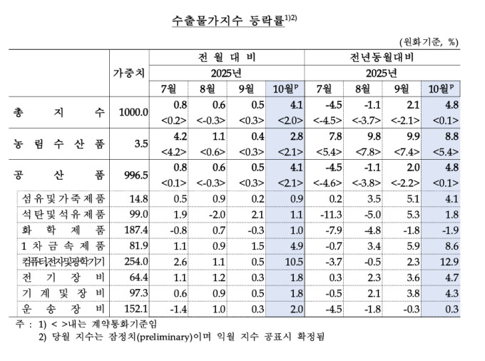 한국은행은 14일 '10월 수출입물가지수 및 무역지수'에서 원화기준 수출물가는 달러/원 환율 상승한 가운데 컴퓨터·전자및광학기기 등이 오르며 전월대비 4.1% 상승(전년동월대비 4.8%상승)했다고 밝혔다.