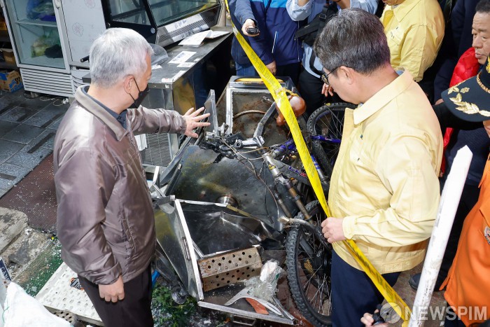 [부천=뉴스핌] 류기찬 기자 = 김동연 경기도지사가 13일 오후 경기 부천시 오정구 제일시장 사고 현장에 방문해 피해 상인들에게 당시 상황을 듣고 있다. 2025.11.13 ryuchan0925@newspim.com