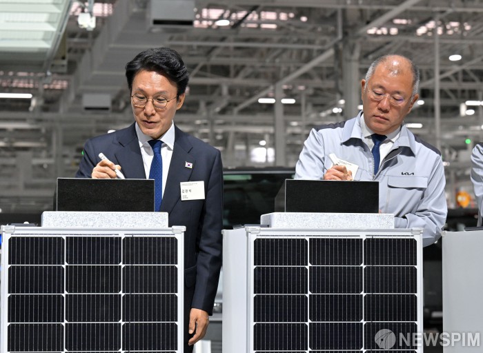 [화성=뉴스핌] 청사사진기자단 = 김민석 국무총리와 정의선 현대차그룹 회장이 14일 오전 경기도 화성에서 열린 기아 화성 EVO 플랜트 East준공식 및 West기공식에서 기념 세리머니로 표시석에 서명을 하고 있다. 2025.11.14 photo@newspim.com