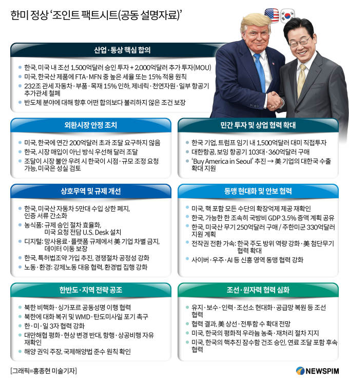"3,500억불 전략적 투자 MOU·관세 인하의 구체안 공개… 반도체는 별도 협상, 비관세 분야는 원칙만 합의"