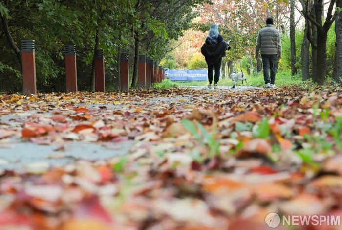 [서울=뉴스핌] 윤창빈 기자 = 완연한 가을 날씨를 보인 14일 서울 여의도 윤중로가 단풍으로 물들어 있다. 2025.11.14 pangbin@newspim.com