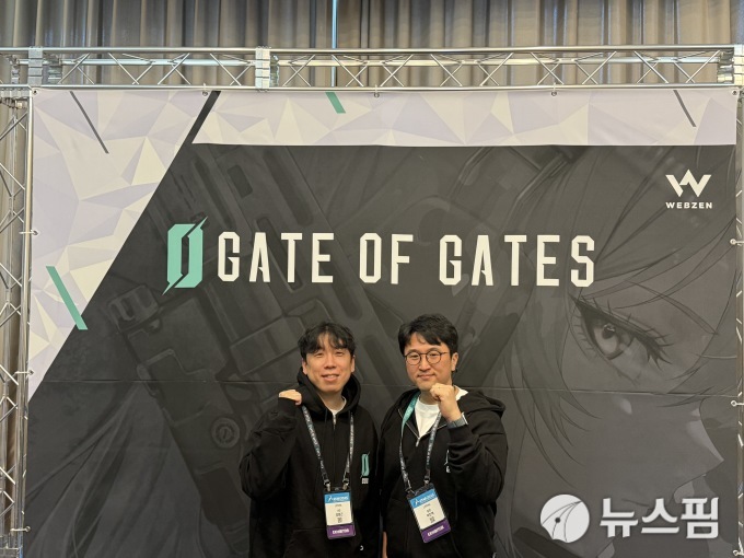 | [부산=뉴스핌] 이성화 기자 = 웹젠 신작 '게이트 오브 게이츠' 개발사 리트레일의 정명근 아트디렉터(왼쪽)와 박찬혁 기획팀장이 미디어 인터뷰 후 기념 촬영을 하고 있다. 2025.11.14 shl22@newspim.com |