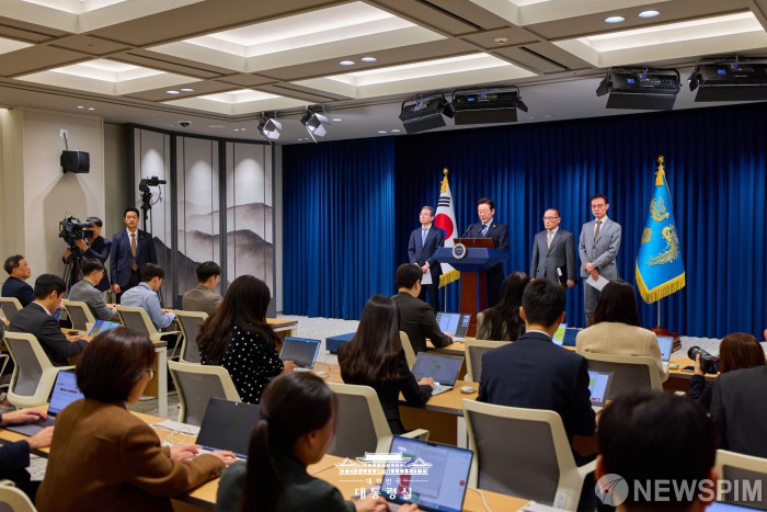 [서울=뉴스핌] 이재명 대통령이 14일 서울 용산 대통령실에서 한·미 팩트시트 타결 결과를 발표하고 있다. [사진=대통령실] 2025.11.14 photo@newspim.com