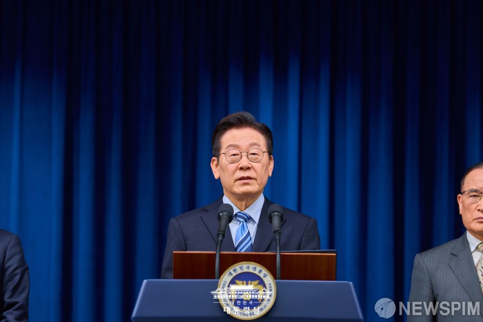 [서울=뉴스핌] 이재명 대통령이 14일 서울 용산 대통령실에서 한·미 팩트시트 타결 결과를 발표하고 있다. [사진=대통령실] 2025.11.14 photo@newspim.com