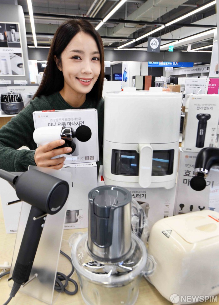 [서울=뉴스핌] 홈플러스가 지난해 3월 선보인 ‘반값가전’이 합리적 소비를 추구하는 고객들의 만족도를 높이며 눈에 띄는 성과를 내고 있다고 17일 밝혔다. 올해 3월부터 10월까지 전체 반값가전 매출은 전년 동기 대비 66%가량 성장했다. 더불어 적극적인 신상품 확대 전략을 통해 동기간에만 총 19종의 신상품을 선보이며 제품 라인업을 대폭 강화했다. 사진은 모델이 17일 홈플러스 메가 푸드 마켓 라이브 강서점에서 '반값가전' 상품을 소개하고 있는 모습. [사진=홈플러스] 2025.11.17 photo@newspim.com