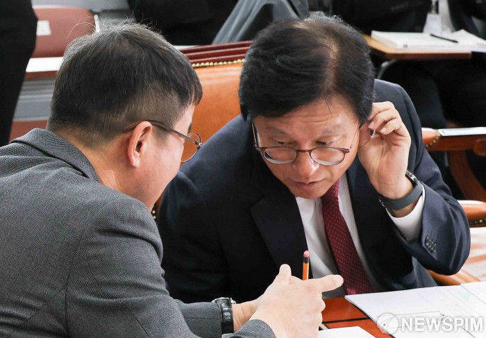 [서울=뉴스핌] 윤창빈 기자 = 한병도 소위원장, 한병도 국민의힘 간사가 17일 오전 서울 여의도 국회에서 열린 예산결산특별위원회 제1차 예산안등조정소위원회에서 대화를 나누고 있다. 2025.11.17 pangbin@newspim.com
