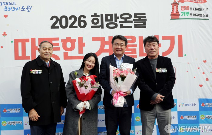 [서울=뉴스핌] 양윤모 기자 = 오승록 노원구청장이 17일 오전 서울 노원구 롯데백화점 노원점 앞 광장에서 열린 ‘2026 희망온돌 따뜻한 겨울나기’ 노원구 사랑의 온도탑 제막식 행사에서 홍보대사 위촉장 수여 뒤 기념촬영을 하고 있다. 사진 왼쪽부터 김충규 민주평통 노원구협의회장, 가수 김소연, 오승록 노원구청장, 이귀한 노원구체육회장. 사랑의 온도탑은 가로 1.5m, 세로 4.65m 크기의 LED 조형물로, 목표 모금액의 1%인 2천5백만 원이 모일 때마다 온도가 1도씩 상승한다. 모금 목표액은 약 25억 원이며, 모금 활동은 내년 2월 14일까지 진행된다. [사진=노원구청] 2025.11.17 yym58@newspim.com