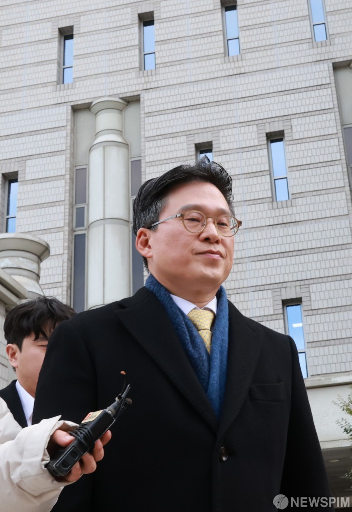 [서울=뉴스핌] 김학선 기자 = 채상병 순직 사건 수사를 방해한 혐의를 받는 김선규 전 공수처 부장검사가 17일 구속 전 피의자 심문(영장실질심사)를 마치고 서울 서초구 서울중앙지법을 나서고 있다. 2025.11.17 yooksa@newspim.com