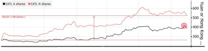 | CATL A주 및 H주 추이 [자료=블룸버그] |