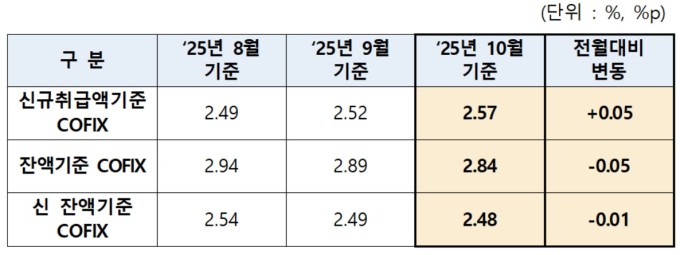 [서울=뉴스핌] 채송무 기자 = 시중은행의 주택담보대출 금리를 결정하는 COFIX(자금조달비용지수)가 전월 대비 0.05% 상승한 2.57%로 나타났다. [표=은행연합회]2025.11.17 dedanhi@newspim.com