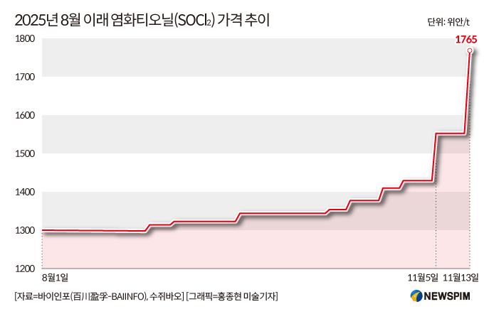 11월 13일 중국 벌크상품 정보 제공업체 바이인포(百川盈孚∙BAIINFO)가 공개한 데이터에 따르면, SOCl₂의 최신 시세는 t 당 1765위안으로, 하루 만에 13.72% 급등했다. 11월 들어 누적 상승률은 23.5%에 달하며, 8월 초 저점 이후 누적 상승폭은 35%를 넘어섰다.