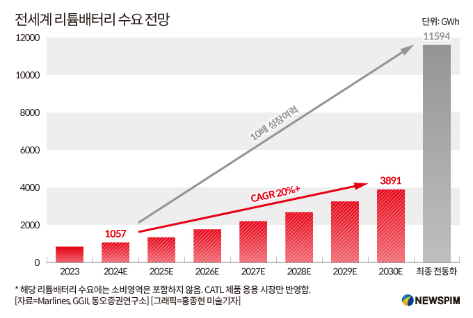 동오증권(東吳證券)이 공개한 데이터에 따르면, 전세계 리튬 배터리 수요는 2024년 약 1057 GWh에서 2030년 3891GWh로 20%의 성장률을 기록할 것으로 예상된다. 최근 몇 년간 글로벌 리튬 배터리 시장은 20~25%의 성장률을 유지하고 있는데, 신흥산업 응용분야의 침투율이 여전히 낮아 장기적으로 자동차 업계의 최종 전동화가 실현되기까지 10배의 성장 공간이 있다고 판단된다.
