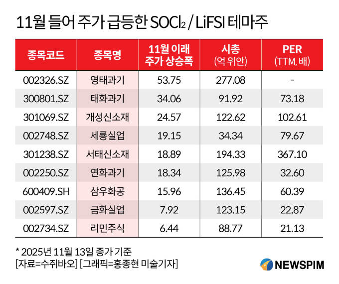 11월 들어 주가가 눈에 띄는 상승세를 타고 있는 SOCl₂와 LiFSI 테마와 연계된 일부 대표 종목은 공식적으로 전해액 핵심소재 테마와의 연계성을 밝히며, 시장의 관심을 더욱 집중시켰다.