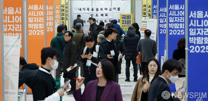 [서울=뉴스핌] 류기찬 기자 = 18일 오전 서울 강남구 세텍 서울무역전시장에서 열린 '서울 시니어 일자리 박람회 2025'를 찾은 구직자들이 부스를 살펴보고 있다. 2025.11.18 ryuchan0925@newspim.com