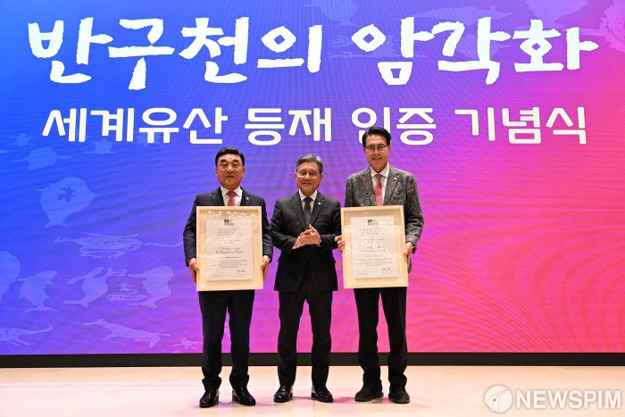 [서울=뉴스핌] 허민 국가유산청장(가운데)이 18일 울산 롯데호텔에서 열린 '반구천의 암각화' 유네스코 세계유산 등재 기념식에서 김두겸 울산시장(왼쪽)과 이순걸 울주군수에게 등재 인증서를 전달한 뒤 기념촬영을 하고 있다. [사진=국가유산청] 2025.11.18 photo@newspim.com
