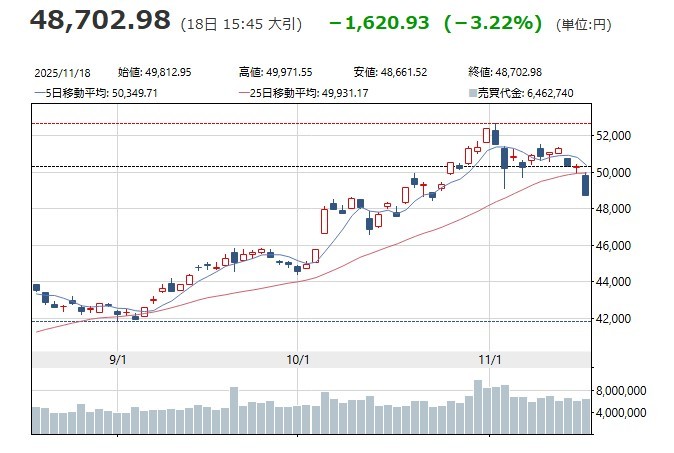 [서울=뉴스핌] 오영상 기자 = 18일 닛케이주가는 엔비디아 실적과 미국의 고용 지표를 기다리는 가운데, 중일 관계 악화에 대한 우려감이 투자심리를 짓누르며 4만9000엔선 아래로 내려섰다. 종가 기준으로는 지난 10월 23일 이후 약 한 달 만의 최저치다.