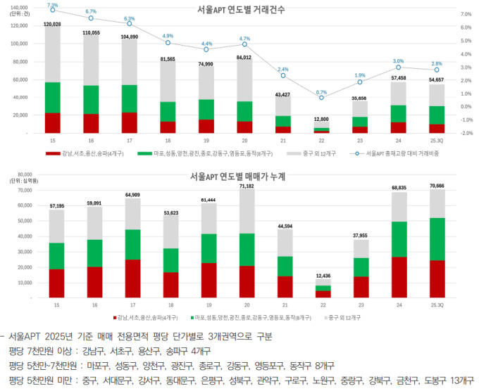 같은 기간 매매거래 건수는 2015년 12만건에서 2025년 5만4000건으로 줄어 총재고 대비 거래비중이 2.8% 수준까지 감소했다. 거래금액은 57조원에서 70조7000억원으로 회복했다.