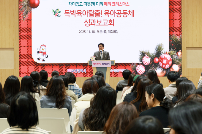 | 박형준 부산시장이 18일 오전 10시 시청 대회의실에서 열린 재미있고 따뜻한! 미리 메리 크리스마스 '독박육아탈출! 육아공동체 성과보고회'에서 인사말을 하고 있다. [사진=부산시] 2025.11.18 |