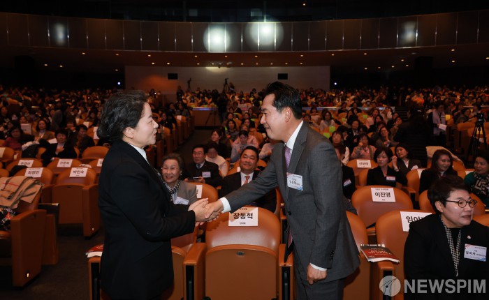 [서울=뉴스핌] 김학선 기자 = 장동혁 국민의힘 대표가 18일 서울 강남구 코엑스에서 '양성평등의 시대, 여성이 함께'라는 주제로 열린 제60회 전국여성대회에서 참석자들과 인사를 나누고 있다. 2025.11.18 yooksa@newspim.com