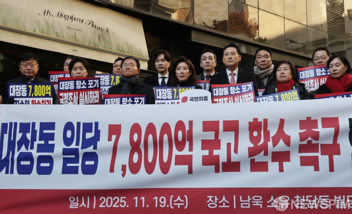 [서울=뉴스핌] 양윤모 기자 = 국민의힘 대장동 일당 7,800억원 국고 환수 촉구 현장 방문행사가 19일 오전 장동혁 대표등이 참석한 가운데 남욱 변호사가 추징보전 해제를 요구한 서울 강남구 ‘청담동 건물'앞에서 진행됐다. 2025.11.19 yym58@newspim.com
