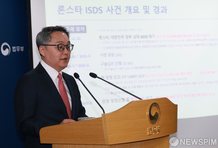 [과천=뉴스핌] 김학선 기자 = 정홍식 법무부 국제법무국장이 19 경기도 과천시 정부과천청사 법무부에서 론스타 ISDS 취소결정 선고 관련 브리핑을 하고 있다. 2025.11.19 yooksa@newspim.com