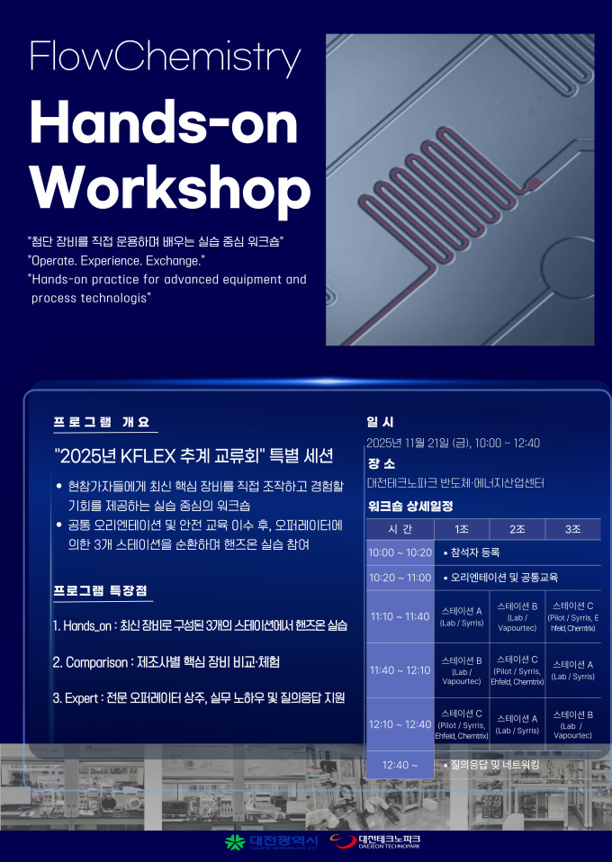 이어 진행되는 특별세션 '유동화학 핸즈온 워크숍(Flow Chemistry Hands-on Workshop)'은 산업 수준의 첨단 화학장비 환경에서 합성 프로세스를 직접 제어·탐구하는 실습형 프로그램으로, 대전TP가 보유한 미세유체·연속흐름반응시스템 등 전국 최고 수준의 장비 인프라를 활용해 운영된다.