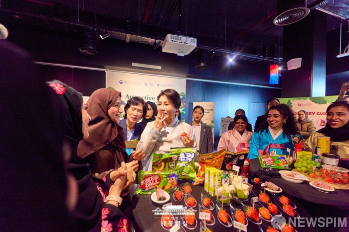 [서울=뉴스핌] 이재명 대통령 부인 김혜경 여사가 19일(현지시간) 아랍에미리트(UAE) 아부다비의 한국문화원에서 열린 '할랄 K-푸드' 홍보 행사장을 둘러보고 있다. [사진=대통령실] 2025.11.20 photo@newspim.com