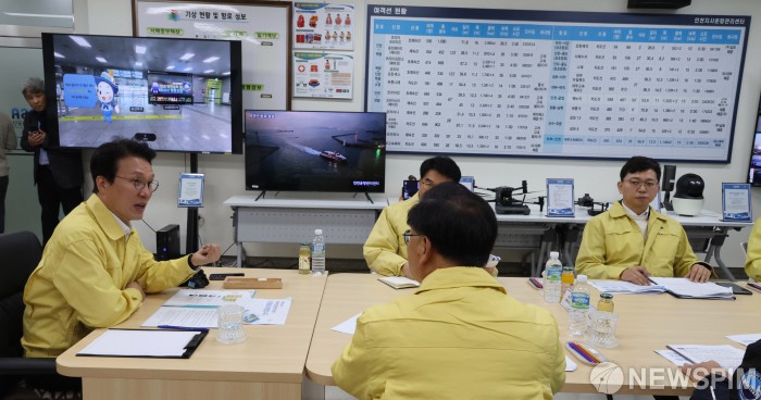 [서울=뉴스핌] 청사사진기자단 = 동절기 해양안전사고 예방 현장점검에 나선 김민석 국무총리가 21일 오전 인천 중구 인천연안여객터미널 운항관리센터를 방문해 박진규 운항관리센터장으로 부터 터미널 안전관리 현황보고를 받고 있다. 2025.11.21 photo@newspim.com