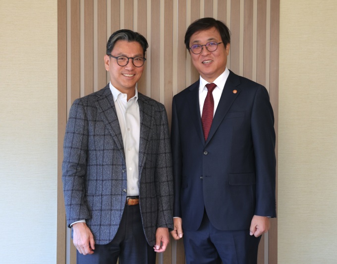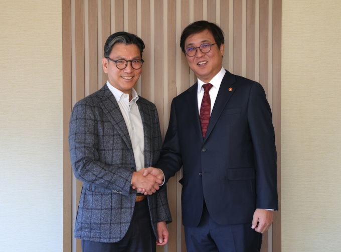 [서울=뉴스핌] 양진영 기자 = 최휘영 문화체육관광부 장관이 21일 서울의 한 식당에서 김재열 국제올림픽위원회(IOC) 위원 및 국제빙상경기연맹(ISU) 회장과 면담을 마치고 기념촬영을 하고 있다.