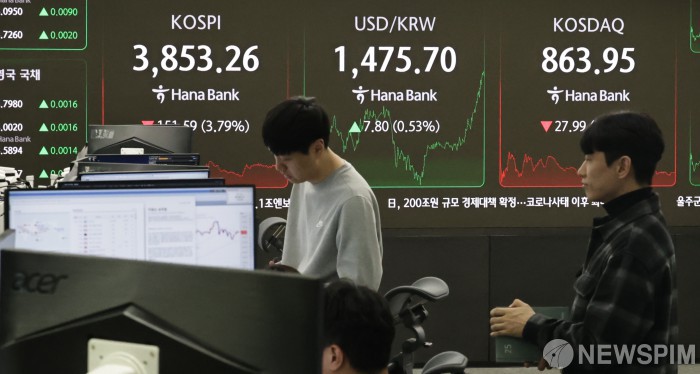 [서울=뉴스핌] 양윤모 기자 = 뉴욕증시가 인공지능(AI) 관련주 거품 우려 지속에 약세로 마감한 가운데, 21일 오후 코스피가 전장 종가보다 151.59 포인트(3.79%) 하락하며 3853.26으로, 코스닥은 27.99 포인트(3.14%) 하락한 863.95로 장을 마감한 가운데, 서울 중구 하나은행 딜링룸에서 직원들이 업무를 보고 있다. 서울외환시장에서 달러/원 환율은 전장 대비 7.80원 상승한 1475.70원에 주간거래를 마감했다. 2025.11.21 yym58@newspim.com