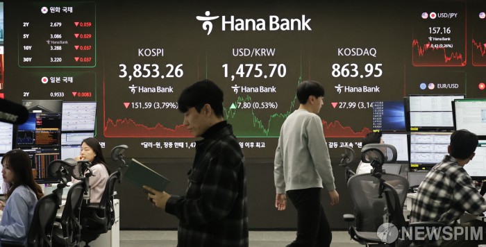 [서울=뉴스핌] 양윤모 기자 = 뉴욕증시가 인공지능(AI) 관련주 거품 우려 지속에 약세로 마감한 가운데, 21일 오후 코스피가 전장 종가보다 151.59 포인트(3.79%) 하락하며 3853.26으로, 코스닥은 27.99 포인트(3.14%) 하락한 863.95로 장을 마감한 가운데, 서울 중구 하나은행 딜링룸에서 직원들이 업무를 보고 있다. 서울외환시장에서 달러/원 환율은 전장 대비 7.80원 상승한 1475.70원에 주간거래를 마감했다. 2025.11.21 yym58@newspim.com