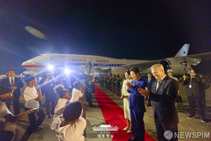 [서울=뉴스핌] 주요 20개국(G20) 정상회의에 참석하는 이재명 대통령이 김혜경 여사와 함께 지난 21일(현지시간) 남아프리카공화국 요하네스버그 OR탐보국제공항에 도착한 뒤 관계자들의 환영을 받고 있다. [사진=대통령실] 2025.11.23 photo@newspim.com