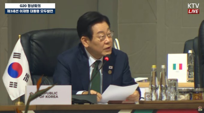 | 이재명 대통령이 23일(현지시간) 남아프리카공화국에서 열린 주요 20개국(G20) 정상회의 제3세션에 참석해 모두발언을 하고 있다. [사진=KTV] |