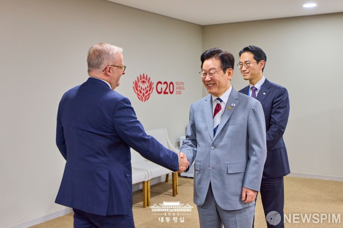 [서울=뉴스핌] 이재명 대통령이 지난 22일(현지 시간) 남아프리카공화국 요하네스버그 엑스포 센터에서 열린 믹타(MIKTA) 정상회동에서 앤서니 앨버니지 호주 총리와 악수를 하고 있다. 믹타는 G20 내 한국, 멕시코, 인도네시아, 튀르키예, 호주의 외교 협의체다. [사진=대통령실] 2025.11.24 photo@newspim.com