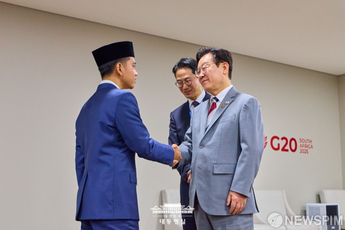 [서울=뉴스핌] 이재명 대통령이 지난 22일(현지 시간) 남아프리카공화국 요하네스버그 엑스포 센터에서 열린 믹타(MIKTA) 정상회동에서 기브란 라카부밍 라카 인도네시아 부통령과 악수를 하고 있다. 믹타는 G20 내 한국, 멕시코, 인도네시아, 튀르키예, 호주의 외교 협의체다. [사진=대통령실] 2025.11.24 photo@newspim.com
