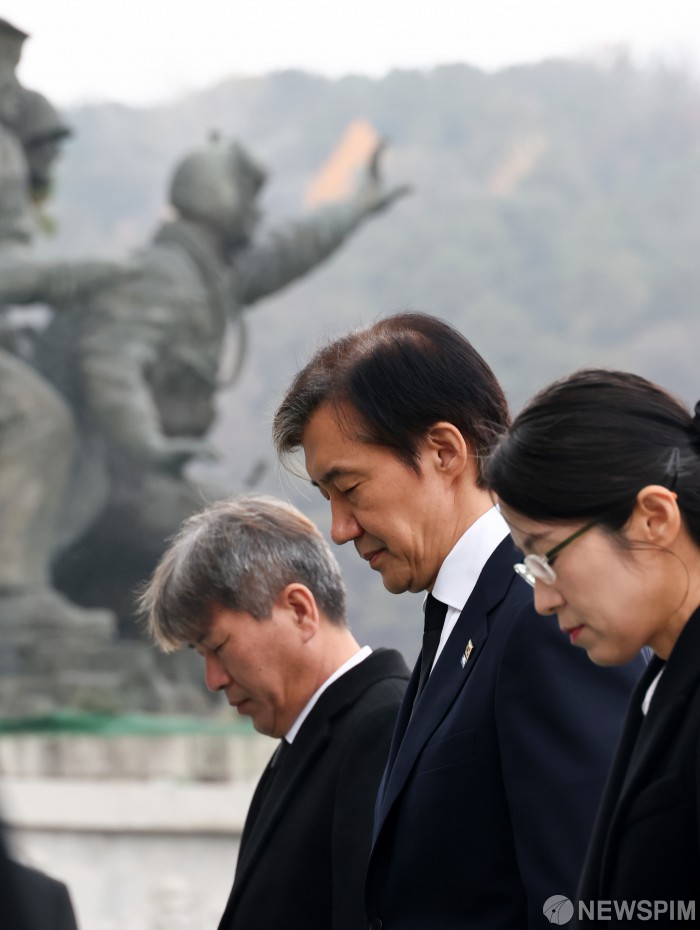 [서울=뉴스핌] 최지환 기자 = 신임 대표로 선출된 조국 조국혁신당 대표가 24일 오전 서울 동작구 국립서울현충원을 찾아 참배하고 있다. 2025.11.24 choipix16@newspim.com
